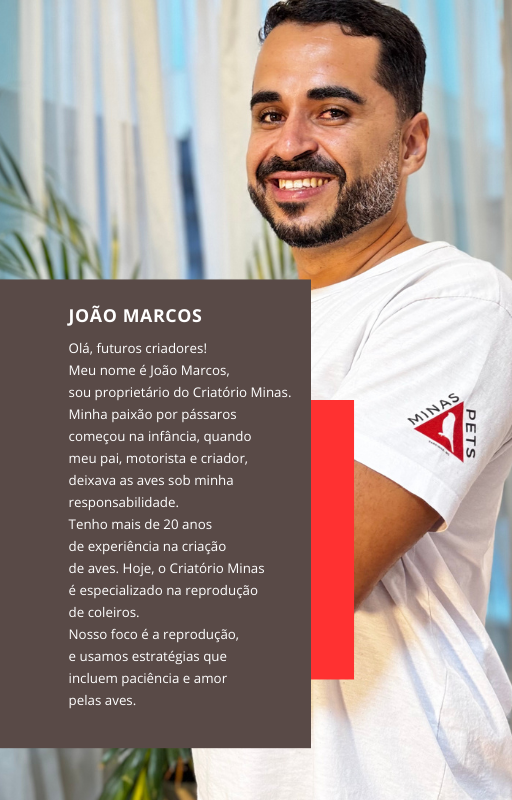 Minha paixão pelos coleiros começou em 2004, e desde então, venho me dedicando à criação responsável dessa espécie tão admirada. Ao longo dos anos, acumulei conhecimento e experiência, obtendo resultados expressivos na reprodução e preservação dos coleiros, sempre focando na qualidade e no manejo adequado para garantir aves saudáveis e bem preparadas.
